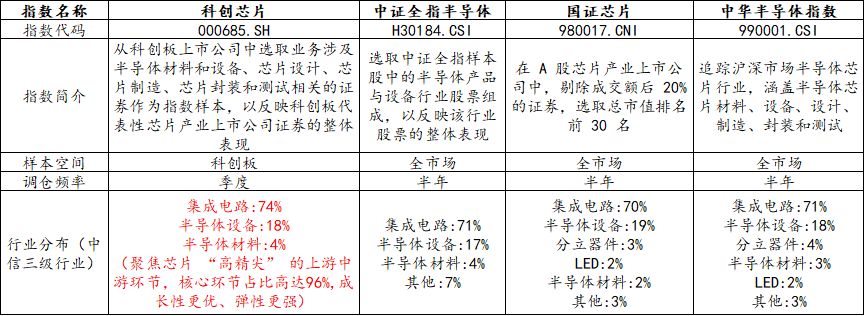 市场上芯片相关指数众多,选取当下热门的科创芯片、半导体等指数进行比较,可以发现,虽然均聚焦为芯片板块,但在指数编制上却大有不同。一句话总结:科创芯片指数聚焦芯片核心环节,“含芯量”更高,弹性强,成长性高