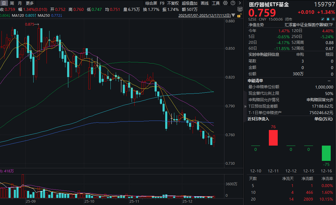 今日(12.17),脑机接口概念股盘中直线拉升,全市场费率最低档的医疗器械ETF基金(159797)收涨1.34%。资金再度青睐,全天获300万份净申购!