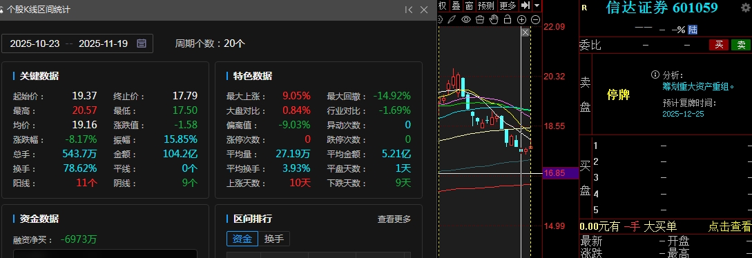 反观信达证券则一路下挫,在10月23日至11月19日的20个交易日中,从19.37元/股一路跌至17.79元/股,区间跌幅超过8.17%。
