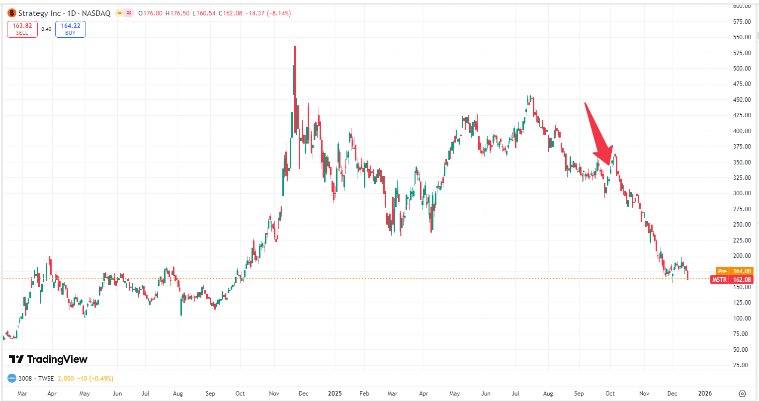 10月1日,比特币涨至12.5万美元,创下新高,但是涨势不能维持,随后出现超30%的回撤,完全抹平2025年以来的涨幅,累计下跌超6%。尽管比特币跌幅不是很大,但是这些比特币股票尤其是Strategy存在高杠杆效应,在下跌的过程中进一步放大其跌幅。更深次的原因是宏观经济压力加剧,风险资产遭到投资者抛售,比特币也成为卖出标的物。
