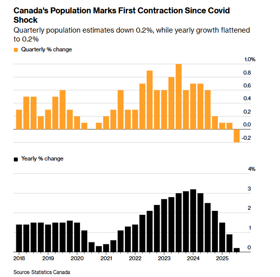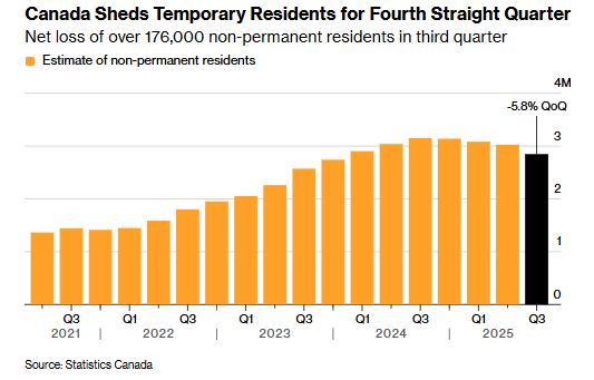 加拿大统计局周三报告称,这一下降主要源于非永久居民数量创纪录的减少。总理卡尼继续减少外国留学生、临时工人和寻求庇护者的人数。