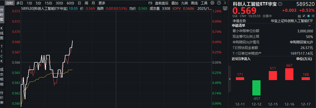 今日(12月18日)字节产业链含量超33%科创人工智能ETF(589520)逆市活跃,场内价格现涨0.53%,上交所数据显示,该ETF此前3日连续获资金净流入,合计金额1346万元,反映资金看好国产AI产业链后市表现,逐步进场布局!