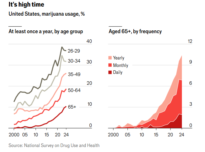 根据国家毒品使用与健康调查(NSDUH),2007年,约每300名65岁及以上美国人中才有1人在过去12个月内使用过大麻;而如今,这一比例已升至10人中有1人。
