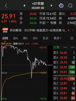 在9月24日收盘时,年内涨幅首次达到10倍以上。随后*ST宇顺继续上涨,9月26日再次涨停,截至收盘股价为41.31元/股,创出历史新高。随后*ST宇顺股价开始回落,在今日盘中,*ST宇顺走出地天板的极端行情,在9点32分到33分这一分钟时间,*ST宇顺从跌停板直接拉至涨停。截至收盘,*ST宇顺报25.91元/股,上涨1.45%。