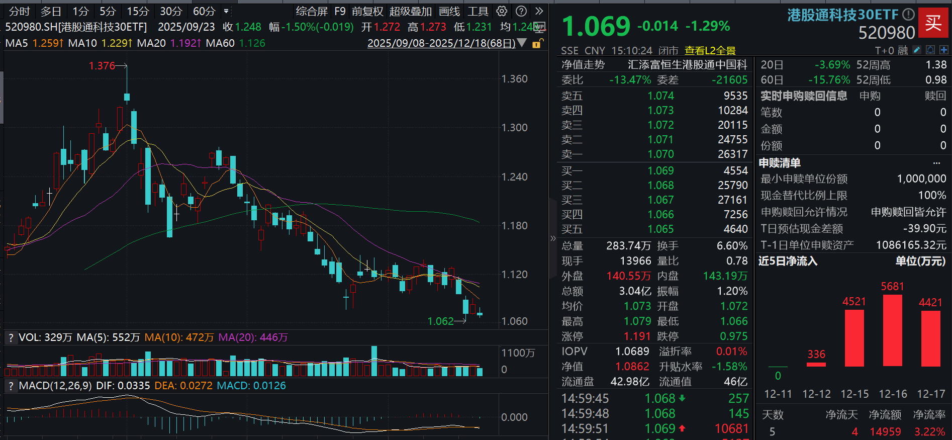 今日(12.18),港股科技再度回调,100%纯度的港股通科技30ETF(520980)跌超1%,全天成交额超3亿元,缩量明显。资金已连续4日净流入,累计“吸金”近1.5亿元!