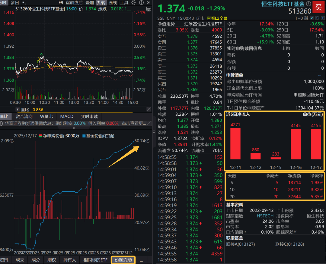 同类唯一15BP最低档管理费的恒生科技ETF基金(513260)亦跌超1%,盘中成交额超3亿元。资金面上,已连续35个交易日获资金净申购,累计净流入超5.8亿元!恒生科技ETF基金(513260)最新规模达70.74亿元,基金最新融资余额超1.6亿元!