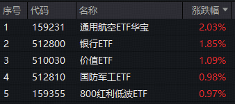 盘面上,银行板块领涨两市,全市场规模最大的银行ETF(512800)场内价格拉升1.85%;国防军工板块主力资金全天净流入额(95.6亿元)高居全行业首位,国防军工ETF(512810)场内价格盘中涨逾2.1%价格触及近3个月高点;同样受益于商业航天题材爆发,通用航空ETF(159231)场内价格劲涨2.03%,一举收复所有均线。