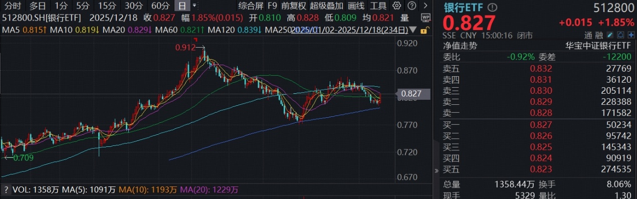 一、【银行全线上行,工农建交涨超2%,规模最大银行ETF(512800)放量收复3条均线,趋势反转?】