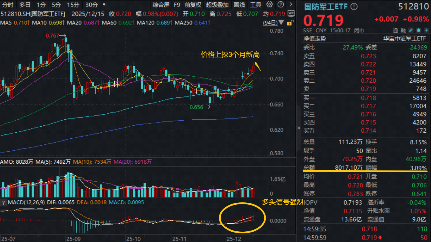 “军技民用”开启万亿赛道,商业航天再爆发,带动军工板块领市上涨,相关核心ETF“512810” 午后涨幅一度冲上2%,价格触及近3个月高点!场内最终收涨0.98%成功连阳,全天振幅超3%,放量成交8017万元。
