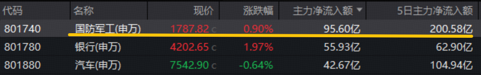 资金面上,主力热情高涨,大举“扫货”!国防军工行业主力净流入95.6亿元,在31个申万一级行业中高居断层首位,领先第二位银行近40亿元!近5日维度,国防军工主力净流入额超200亿元。