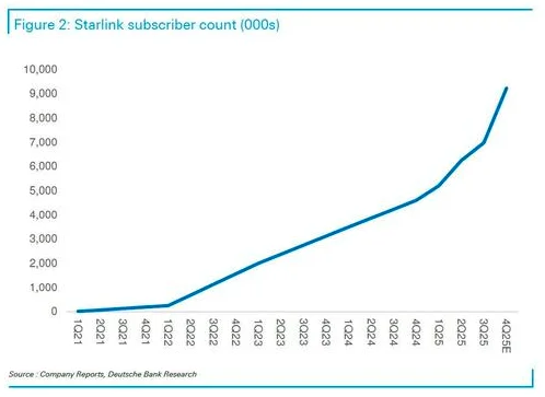 星链(Starlink)利用SpaceX火箭部署近地轨道星座,提供高速卫星互联网服务。德意志银行(Deutsche Bank)认为,到2025年底,星链(Starlink)用户将突破900万,实现同比翻番。