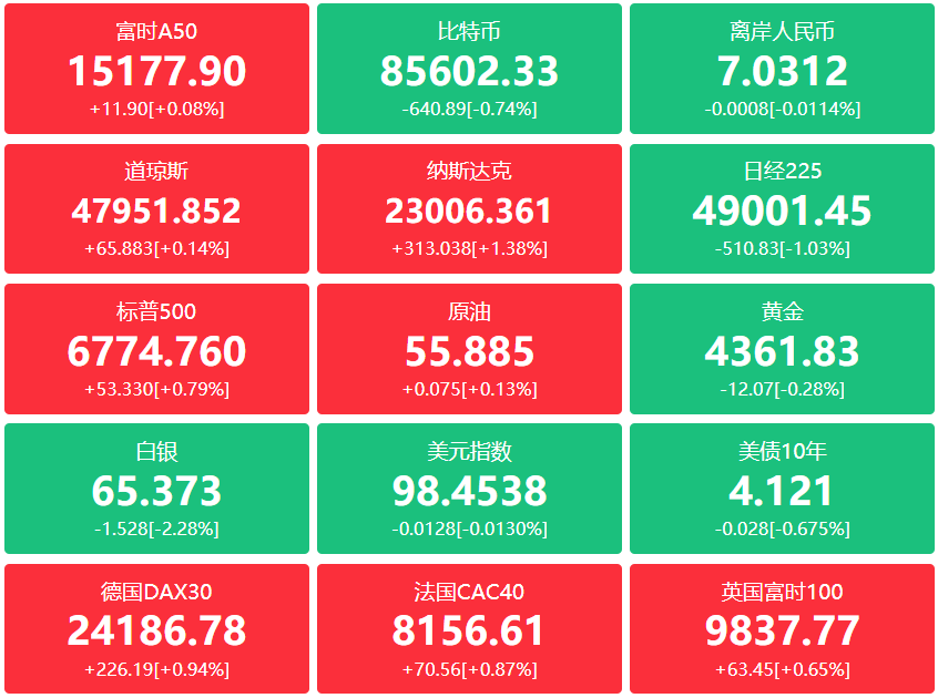 大型科技股集体上涨,英伟达涨1.79%,苹果涨0.13%,微软涨1.65%,谷歌涨1.93%,亚马逊涨2.48%,Meta涨2.30%,特斯拉涨3.45%,博通涨1.14%,甲骨文涨0.88%,奈飞跌0.83%,美光科技涨10.21%。