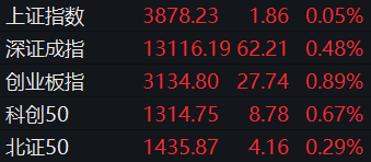 沪指开盘涨0.05%,报3878.23点,深成指涨0.48%,报13116.19点,创业板指涨0.89%,报3134.8点,科创50指数涨0.67%,报1314.75点。沪深两市合计成交额149.5亿元,全市场近3000只个股上涨。
