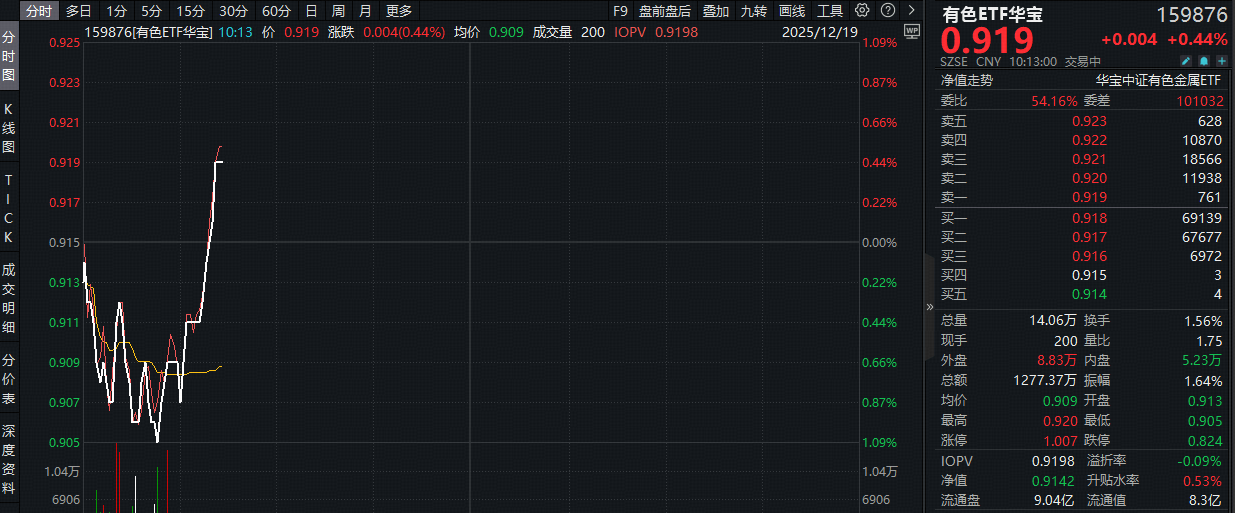 今日(12月19日)早盘,有色金属板块从水面下强势拉升翻红,同标的指数规模最大的有色ETF华宝(159876)场内价格现涨0.44%,当前站在所有均线上方。