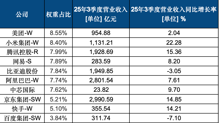 图:恒生科技指数前十大成份股25年3季度营收表现