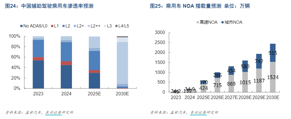 随着智能化的量变到质变,中国L2 辅助驾驶功能渗透率持续增长。根据盖世汽车数据,2025年L2级以上辅助驾驶渗透率预计将达到65%,搭载城区NOA的乘用车达170万辆,后续城区NOA功能也将迎来飞速发展,预计2030年L2级辅助驾驶渗透率预计将达到88%,L3级以上辅助驾驶渗透率预计将达到11%,搭载城市NOA的乘用车将达到915万辆。