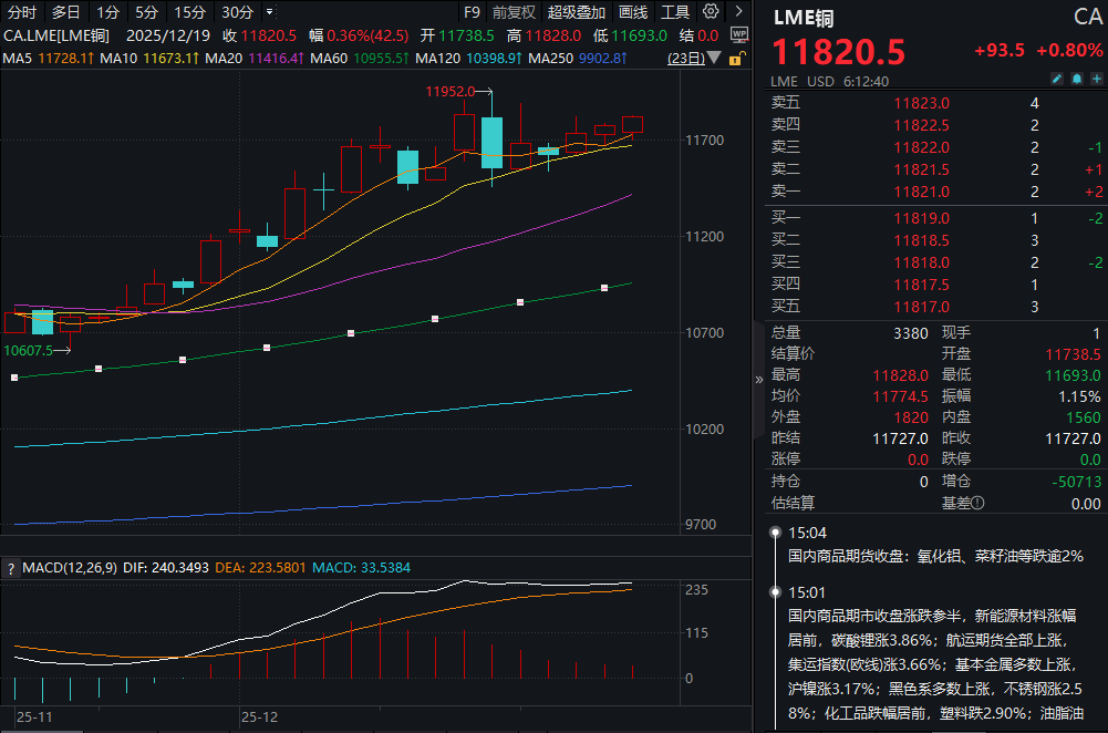 关于铜价,中信证券最新发布报告表示,随着11月中旬以来库存拐点已现,叠加美联储降息预期和国内减产发酵,年底前LME铜价有望加速迈向12000美元/吨。展望2026年,预计12000美元将成为铜价的崭新起点。(来源于中信证券20251205《金属行业铜行业深度报告:库存拐点已至,叙事加速共振,铜价迈向万二》)