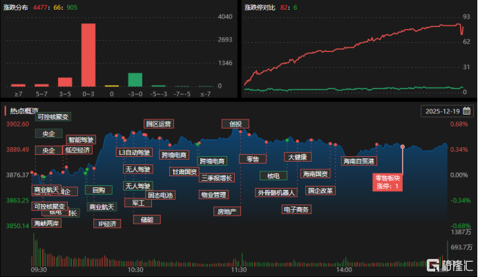 12月19日,沪指涨0.36%,深证成指涨0.66%,创业板指涨0.49%,北证50涨0.99%。全市场成交额17392亿元,较上日成交额放量625亿元。海南自贸区板块拉升,半导体板块调整。