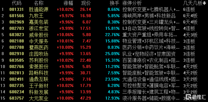 胜通能源6连板,九牧王、嘉美包装6天4板,浙江世宝4连板,威帝股份4天3板,中天服务、鹭燕医药、庄园牧场、苏利股份3连板,索菱股份、路畅科技4天2板,大元泵业、科新发展、通鼎互联、王子新材3天2板。