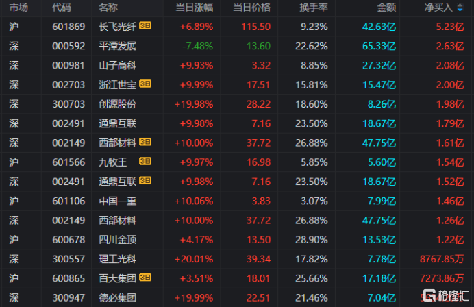 龙虎榜单日净买入额前三为平潭发展、山子高科、创源股份,分别为2.63亿、2.08亿、1.98亿。