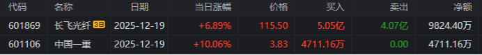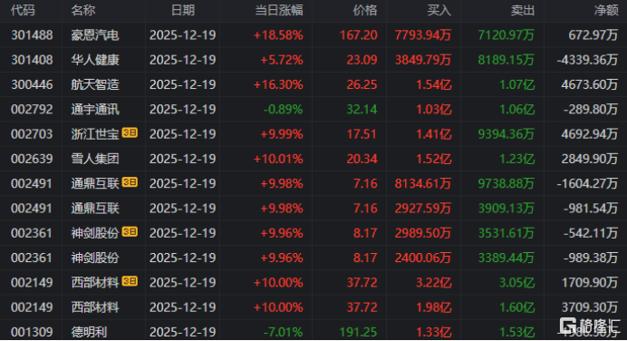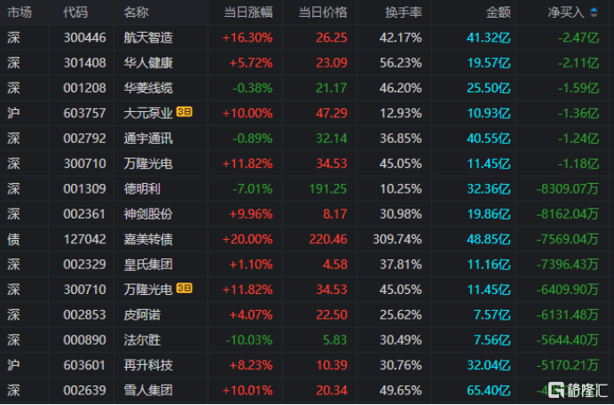 龙虎榜单日净卖出额前三为航天智造、华人健康、华菱线缆,分别为2.47亿、2.11亿、1.59亿。