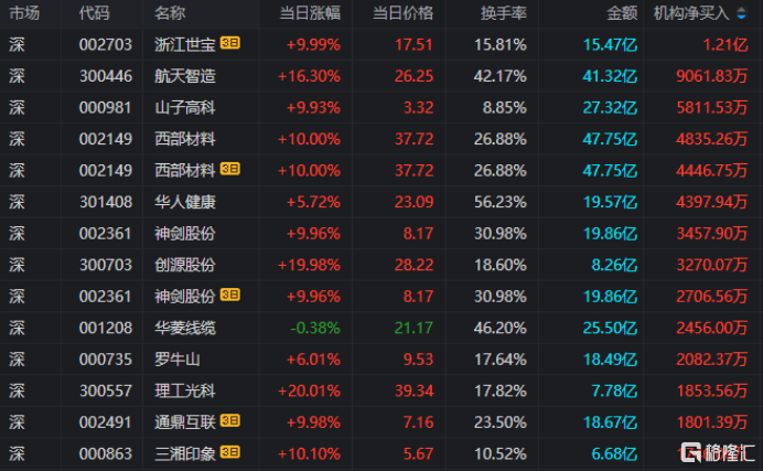 龙虎榜中涉及机构专用席位的个股中,单日净买入额前三为航天智造、山子高科、西部材料,分别为9061.83万、5811.53万、4835.26万。