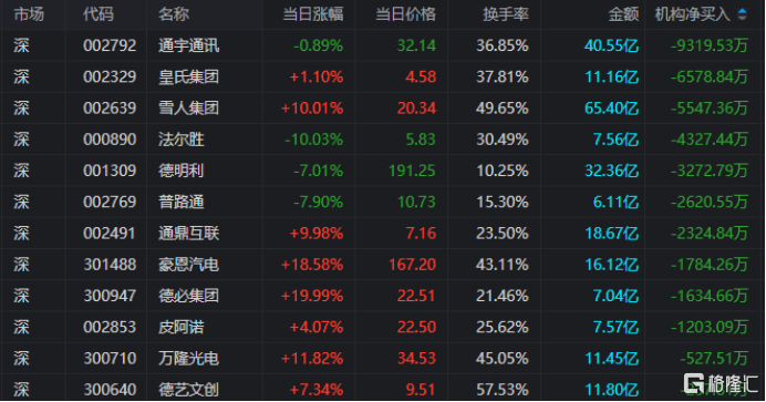 龙虎榜中涉及机构专用席位的个股中,单日净卖出额前三为通宇通讯、皇氏集团、雪人集团,分别为9319.53万、6578.84万、5547.36万。