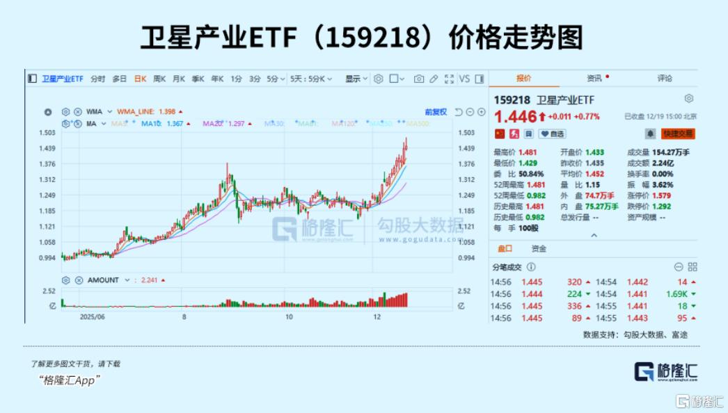 在A股,2025年至今(截至12月19日),商业航天指数年内涨幅59.56%,显著跑赢大多数行业。其中,作为今年5月22日新上市的卫星产业ETF(159218)年内上涨44.46%,成为市场热门品种。