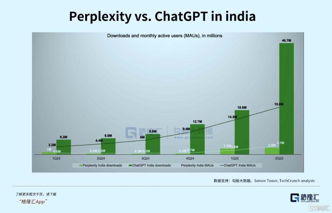 根据市场情报公司Sensor Tower统计的数据,截至上周,ChatGPT在印度的日活跃用户同比增长607%,达到7300万,是美国用户数量的两倍多;Gemini在印度的日活跃用户达到1700万,而美国的用户数量为300万。