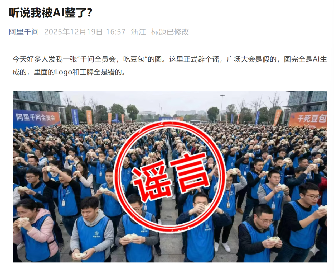 阿里千问团队迅速辟谣,指出这完全是AI生成的假图,并幽默回应:“全是错的,Logo不对,工牌也不对。不过欢迎大家多来玩千问APP的生图功能。”