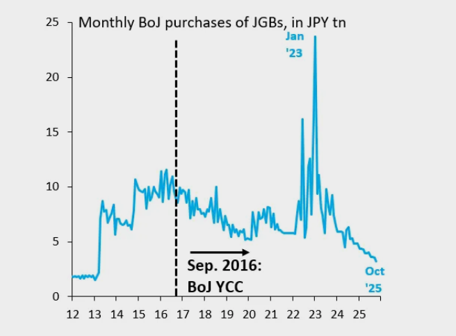 说日本财政刺激政策走到尽头的原因在于,日本央行仍是政府债务的主要买家,正如图表所示。这意味着,日本的收益率正被央行人为压低,若没有这一干预,收益率将远高于当前水平。那将使日本陷入债务危机,而现任及历届政府都不愿正面应对这一现实。