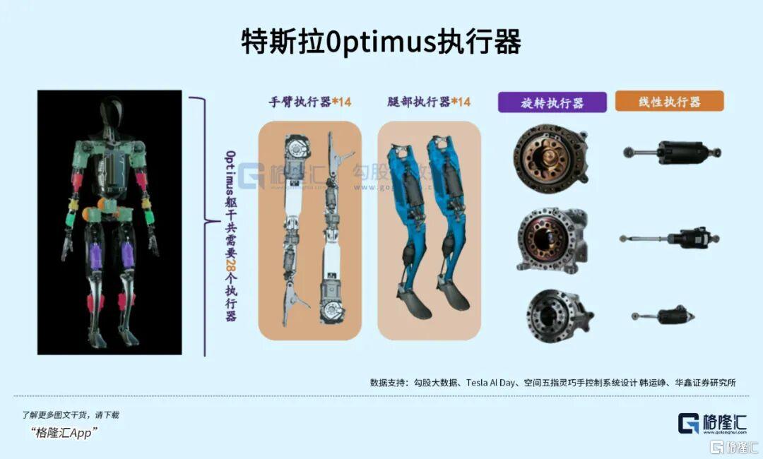 机器人关节数量多,每个关节需配备至少一个执行器。根据公开信息,特斯拉Optimus有28个身体关节执行器,灵巧手还需额外的微型执行器。预计量产物料成本中运动系统(包含线性执行器 旋转执行器 灵巧手)成本最高,约占70%以上。
