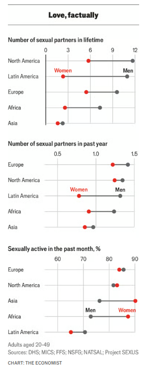 差异巨大。一名50岁的刚果男性平均有20个性伴侣,而印度男性只有9个。各大洲内部差异同样显著。