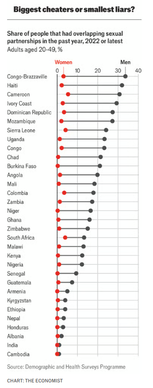 女性一生的平均性伴侣数量,柬埔寨是1.2个,在加蓬是9个;男性则从尼日尔的2.4个到加蓬的21个不等。有些国家符合“男性越富有越多伴侣”的刻板印象,但在印度和马达加斯加,恰好相反。较贫困男性伴侣更多,可能是因为他们常常离家外出打工,在外买春。