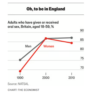 口交曾一度是禁忌,妓女的收费比阴道性交还高,但现在已成为常见做法,尤其是在收入较高与年轻群体中。相比之下,肛交的情况不同。2010年,英国25至34岁的男性中约50%、女性中约40%尝试过肛交,但过去一年内再次尝试的比例不到一半。