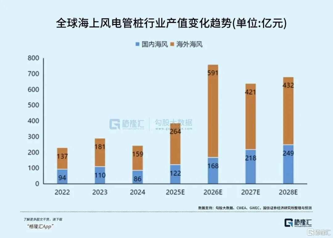 海上风电管桩的单位价值,未来三年预计会保持稳定。一方面,海上风电设备大型化会让成本有下降趋势;另一方面,海风向深远海发展以及漂浮式风电的应用,又会提升管桩的价值,两者相互抵消后整体保持平稳。