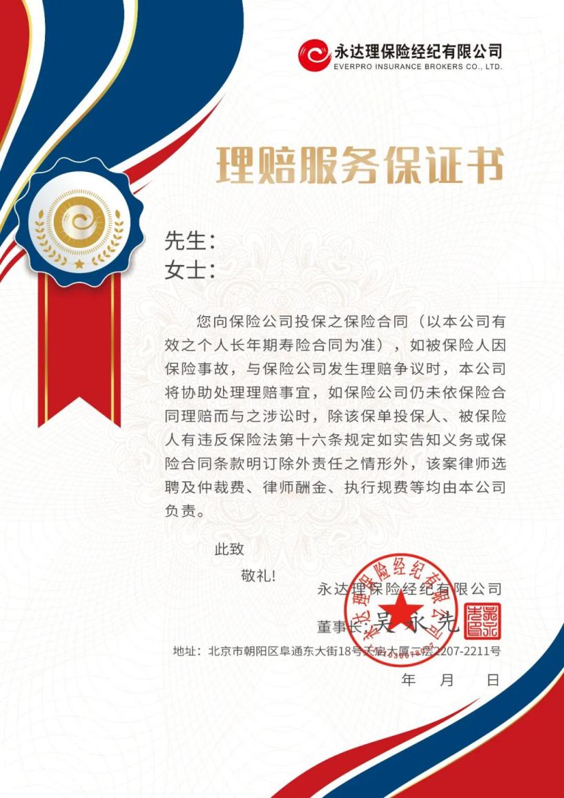 永达理向客户送出的每一份个人长年期(保险期间大于1年)人身险保障,都会附带一份《理赔服务保证书》,以保证投保后在发生理赔争议时,最大程度保障客户利益。这是永达理用实际行动,为客户的安心兜底的郑重承诺。