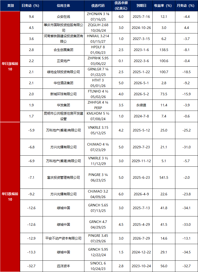 3. 中资美元债每日价格变动(截至12月19日收盘)