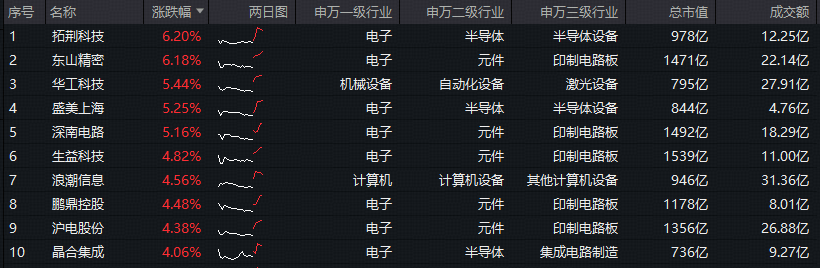 细分方向来看,半导体设备龙头方面,拓荆科技涨超6%,盛美上海涨逾5%;PCB(印制电路板)龙头方面,东山精密涨超6%,深南电路涨逾5%,生益科技、鹏鼎控股、沪电股份携手涨超4%。