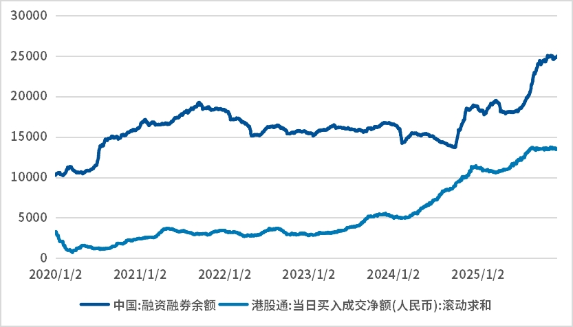 图:两融余额, 南向资金自23以来显著上升, 投资者交易情绪高涨
