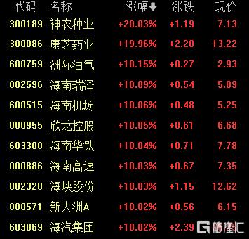 海南板块掀涨停潮,神农种业、康芝药业20cm涨停,洲际油气、海南瑞泽、海南机场、欣龙控股、海南华铁等超20股涨停。