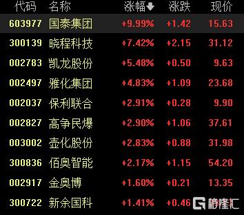 民爆概念股走强,国泰集团涨停,晓程科技涨超7%,凯龙股份涨超5%,雅化集团、保利联合、高正民爆等跟涨。