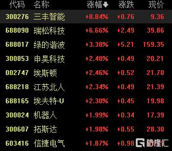 机器人概念全线上涨,三丰智能涨超8%,瑞松科技涨超6%,绿的谐波、申昊科技、拓斯达等跟涨。