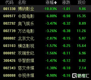影视股跌幅居前,博纳影业跌停,中国电影跌超6%,奥飞娱乐、万达电影跌超3%,北京文化、横店影视等跟跌。