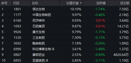 港股通创新药ETF(159570)标的指数权重股多数飘绿:亚盛医药-B跌超3%,信达生物、康方生物、科伦博泰生物-B跌超1%,中国生物制药、三生制药、翰森制药微跌。上涨方面,百济神州、石药集团微涨。