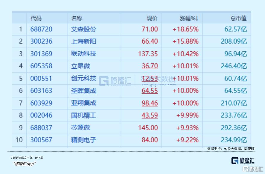 芯片制造链中,艾森股份、上海新阳、联动科技、立昂微、创元科技、圣晖集成、亚翔集成等多只相关概念股涨停或涨超10%。