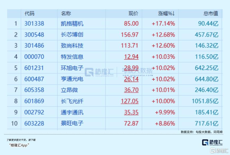 铜缆高速链接和共同封装光学(CPO)环节中,鼎通科技收涨20CM,凯格精机大涨17.14%,长芯博创、致尚科技、特发信息、环旭电子、亨通光电、长飞光纤、通宇通讯等多股强势涨停。中际旭创、新易盛、胜宏科技、天孚通信等头部巨头虽然没有涨停,但也走出了显著上涨行情。