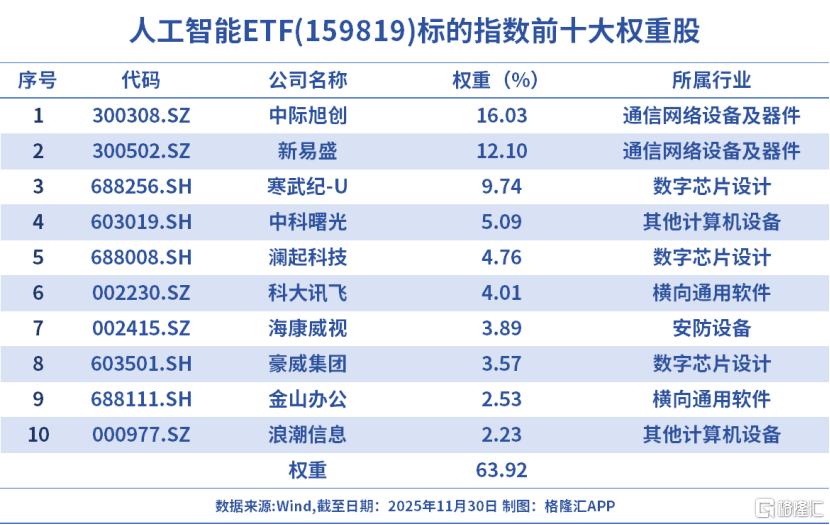比如今年来备受资金青睐的覆盖AI全产业链的人工智能ETF(159819),其成份股包括中际旭创、新易盛、寒武纪、中科曙光、澜起科技等通信设备、芯片半导体、服务器等环节的核心龙头。