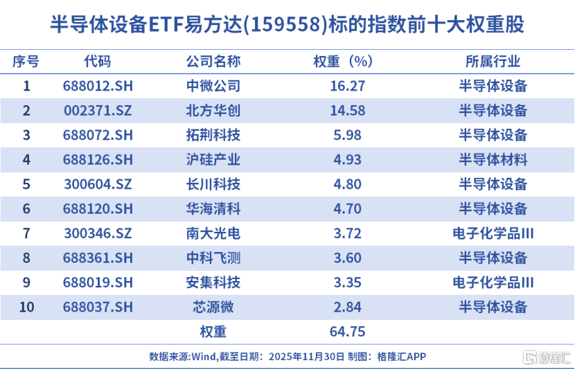 比如半导体设备ETF易方达(159558)标的指数紧扣半导体两大“卡脖子”主线——半导体设备(61.9%) 半导体材料(21.8%),被市场视作产业链“卖铲子”的角色,成份股覆盖光刻机、蚀刻机、薄膜沉积设备及硅片、光刻胶等关键环节龙头企业,前十大成分股包括了中微公司、北方华创、拓荆科技、沪硅产业、长川科技等业内龙头。