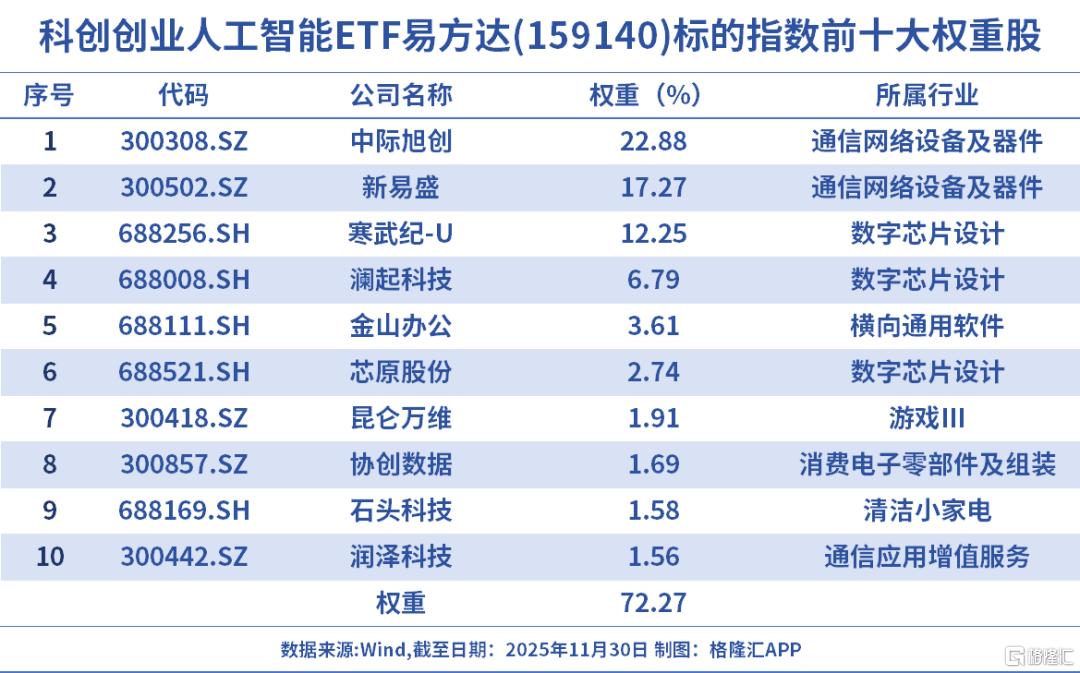 类似的还有科创创业人工智能ETF易方达(159140),也可以一键打包人工智能核心上市公司,汇聚“双创”核心A内力量,前十大成份股权重占比超71%深度聚焦人工智能领域核心企业,覆盖光模块龙头和国产A芯片龙头,中际旭创占比22.88%,新易盛占比17.27%。